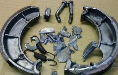 Jarrupoljinkin oli jumissa ja ajattelin kenties jarrukengän jousen katkenneen. Takapyörä irti ja jarru auki - yllätys oli melkoinen, kun lattialle helähti pusillinen alumiiniromua