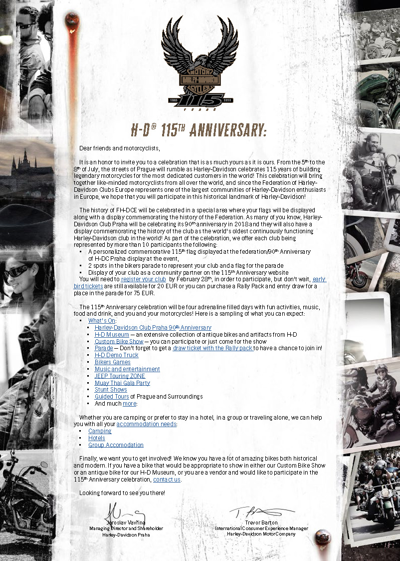 Odotamme innolla kohtaamistamme, ja kiitämme jo etukäteen kaikkia teitä Prahassa järjestettäviä H-D:n 115-vuotisjuhlia kohtaan osoittamastanne tuesta!