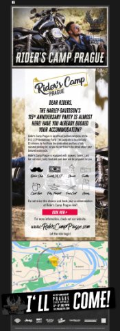 Muistutan myös, että tapahtuma-alueena olevan saaren välittömässä läheisyydessä, heti joen toisella puolella, sijaitsee vartioitu pyöräparkki ja camping-alue. Tutkittehan ohessa olevia lisätietoja tai pistäydytte verkkosivulla www.riderscampprague.com/.