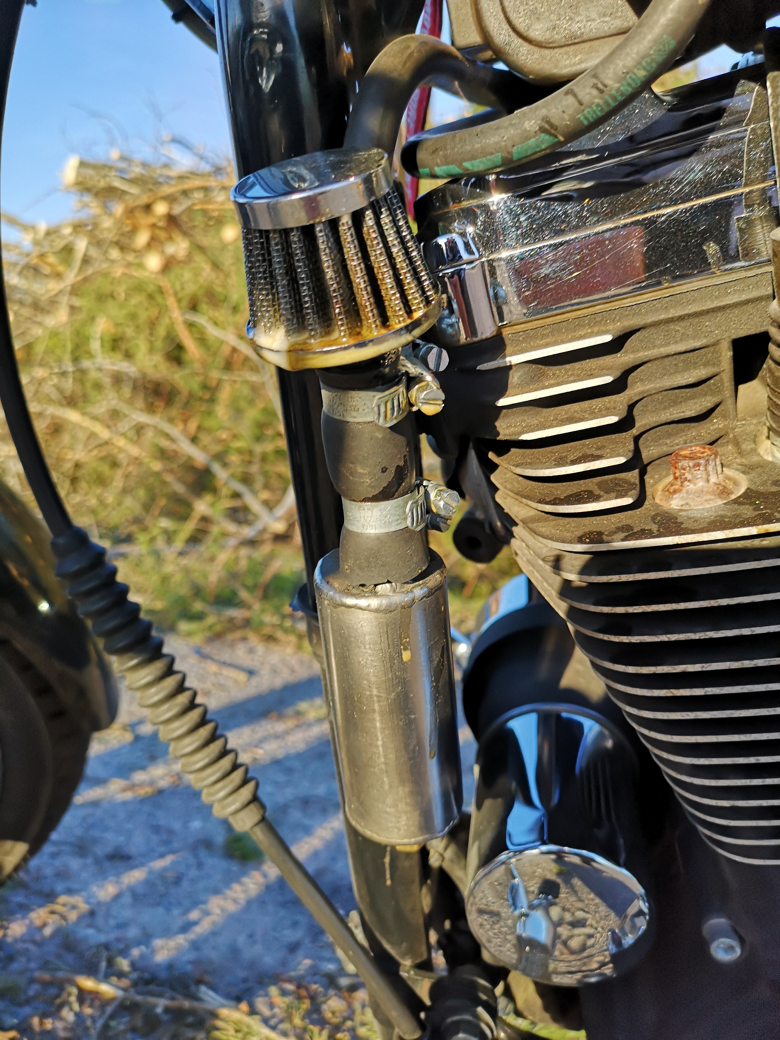 Ostin hiljattain 1200 sporsterin vuosimallia 2001. Pyörään on vaihdettu ilmanputsari sellaiseen KN malliseen vapaavirtasuodattimeen. Huohotus on viety letkulla pyörän toiselle puolelle öljysuodattimen yläpuolelle ruuvattu sellainen pieni säiliö jossa myös pieni huohotus suodatin. Kerran päästelin menemään sellaista moottiritievauhtia 120-130km/h noin 15 kilometriä. Pyörä puski huohottimen täyteen ja räki siitä pienestä suodattimesta pitkin housunlahkeita ruskeaa öljyn ja bensan sekoitusta. Samassa ilmeisesti kaasarin neulaventtiili meni jumiin ja bensa tulvi kaasarista ja yön jälkeen tankki oli valuttanut bensan maahan ja ensiövetoon + moottoriöljyn sekaan. Kaikki öljyt ja suodattimet vaihtoon, perusteellinen putsaus kaikkialle.