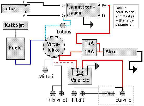 Yksinkertaiset sähköjohdotukset tasavirtapeliin. Kuva Santtu