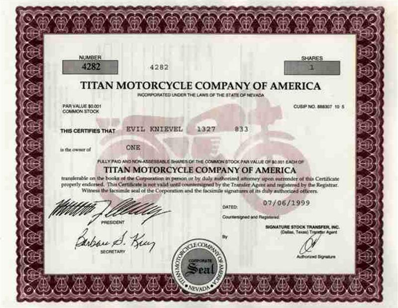 Titan moottoripyörätehtaan osake, tämä Evel Knievelin nimissä.