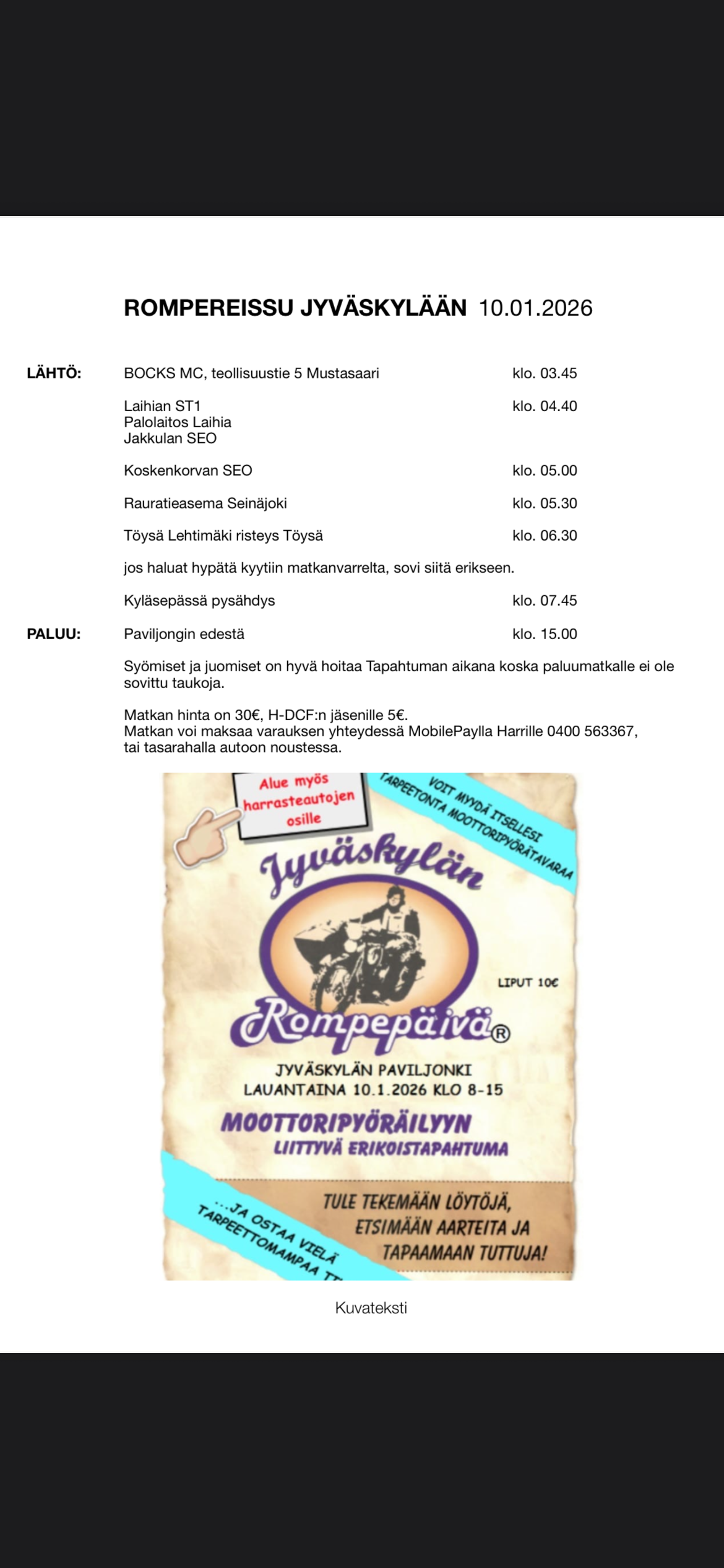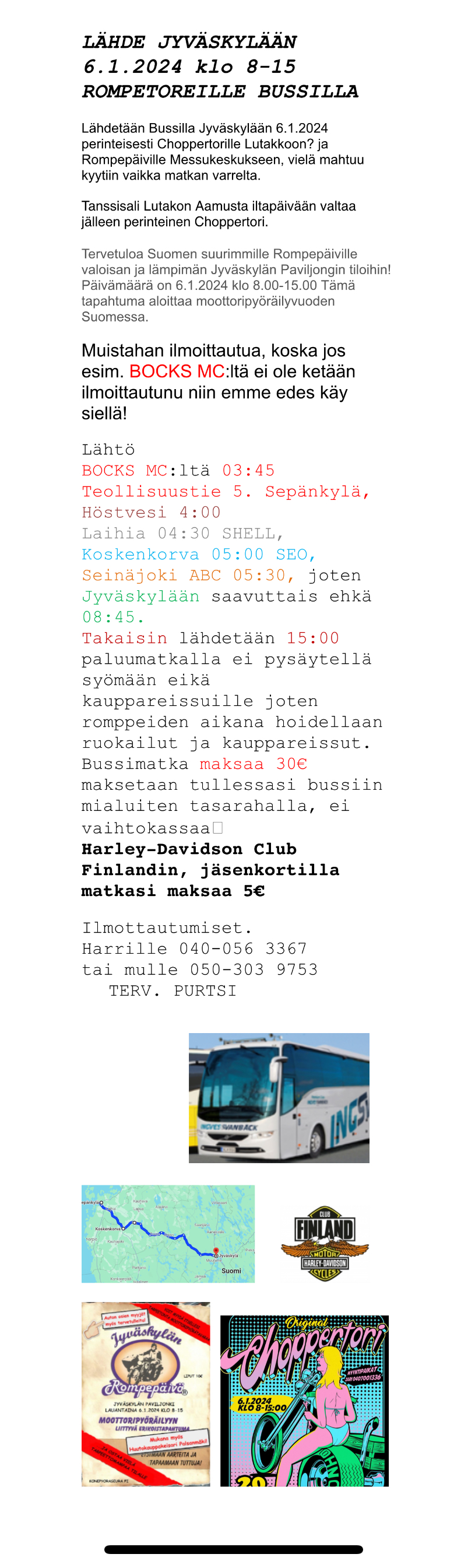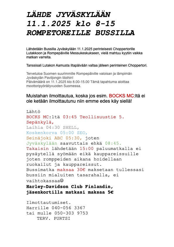 Jos tunnet tarvetta Bussikyydille alueeltamme MP-Messuille, niin laita sähköpostia chapter4@hdcf.fi ja ilmaise kiinnostuksesi. Jos kiinnostus kyytiä kohtaan on riittävä niin katsotaan onko mahdollista järjestää kuljetus järkevästi.