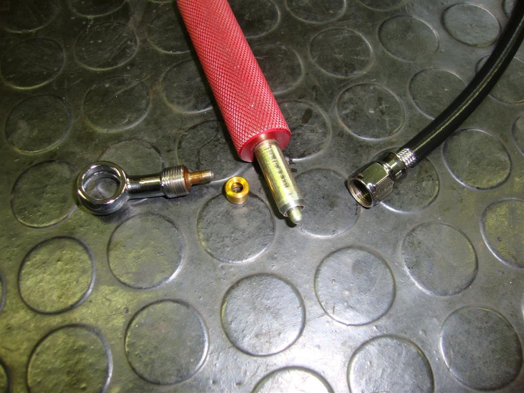 Ennen kutistesukan kutistamista kuumailmapuhaltimella, laitan valmiin letkun paikoilleen, uudet oikeankokoiset tiivisteet (kupari, alumiini, alumiini/kumi), jarrunesteet sisään, ilmaus ja paineet järjestelmään lukitsemalla poljin/kahva paineasentoon.