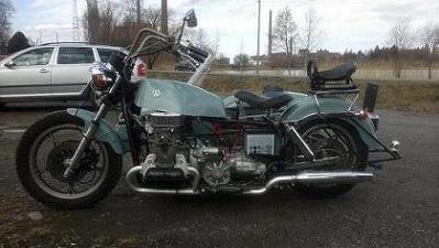 Projektipyörässä 70-luvun harleyn takapää ja svingi. Edessä nelipyttynen auton moottori ja vaihdelaatikko.